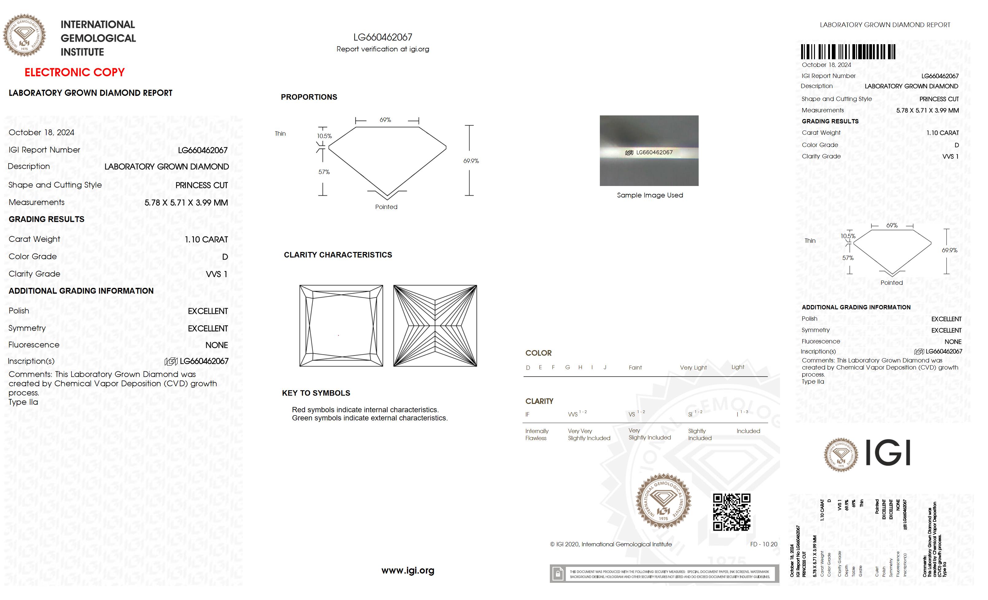 The diamond was certified by IGI. This provides you an authoritative analysis of your diamond. It also verifies that your diamond meets all the specific quality.