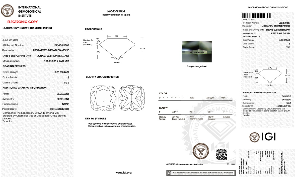 The diamond was certified by IGI. This provides you an authoritative analysis of your diamond. It also verifies that your diamond meets all the specific quality.