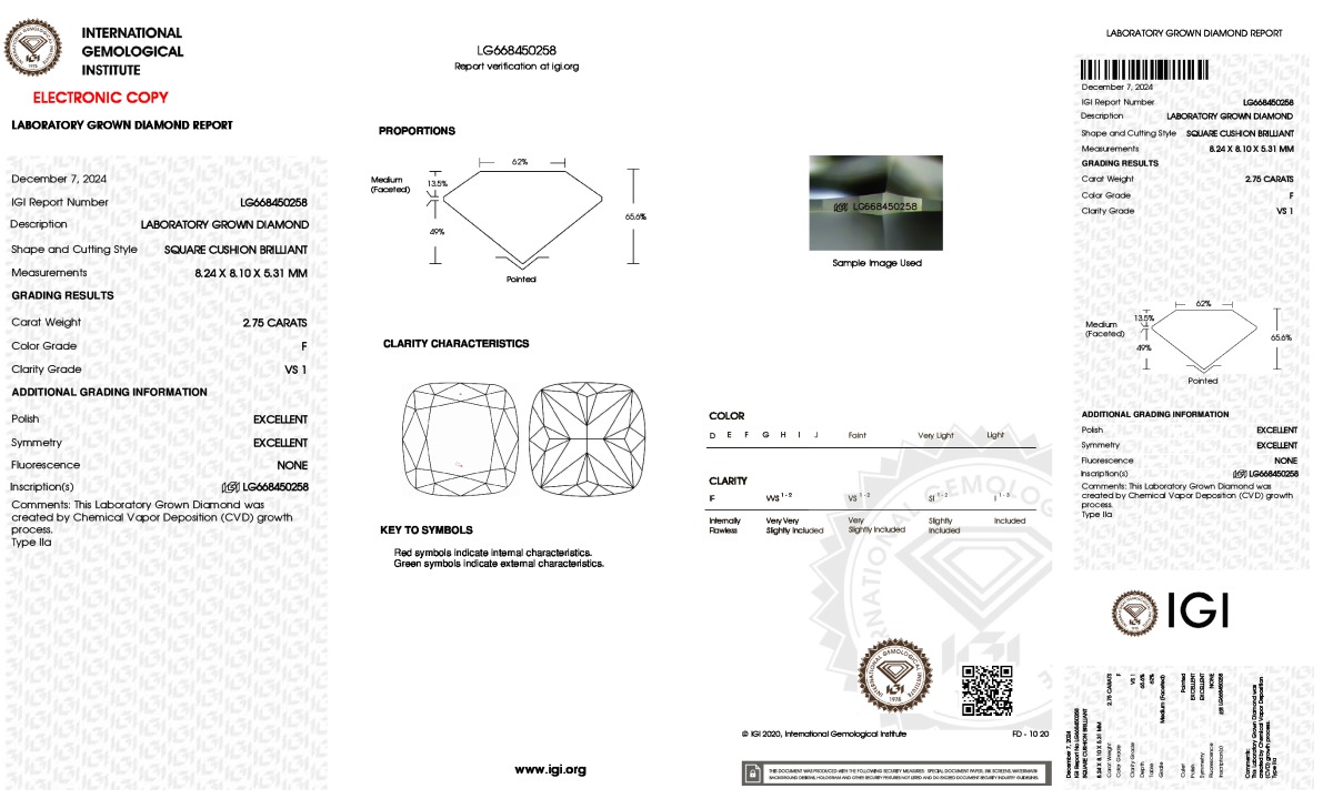 The diamond was certified by IGI. This provides you an authoritative analysis of your diamond. It also verifies that your diamond meets all the specific quality.