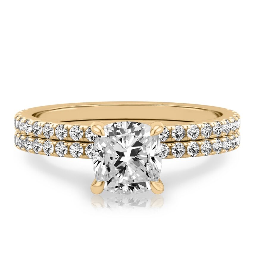 cushion cut diamond delicate pave hidden halo engagement ring set yellow gold