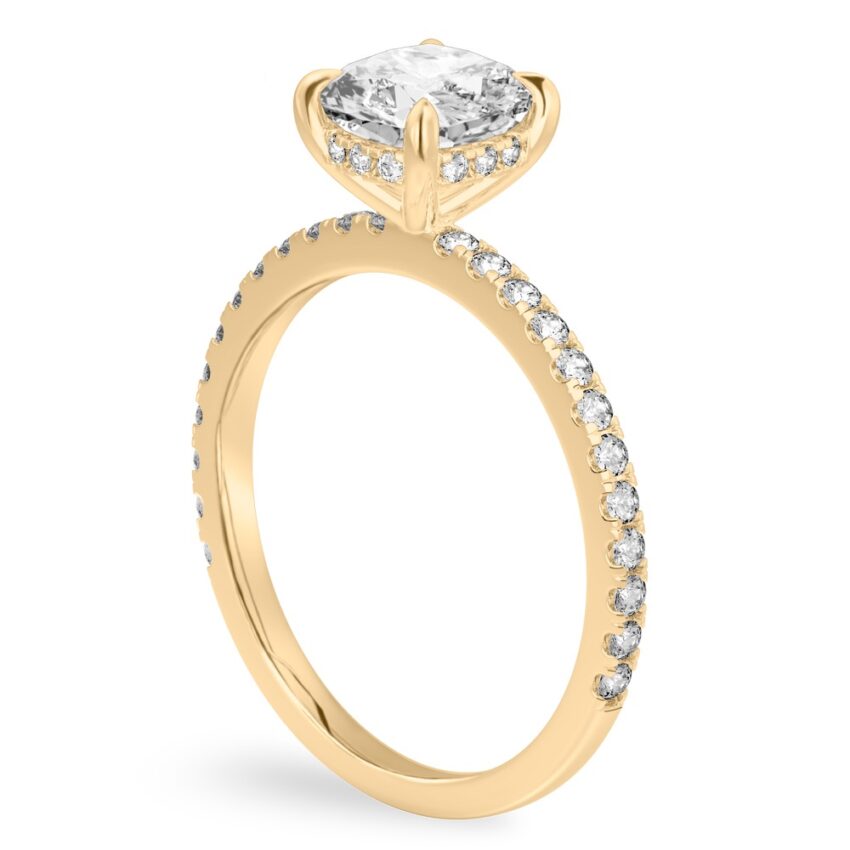 Side view of cushion cut diamond delicate pave hidden halo engagement ring set yellow gold