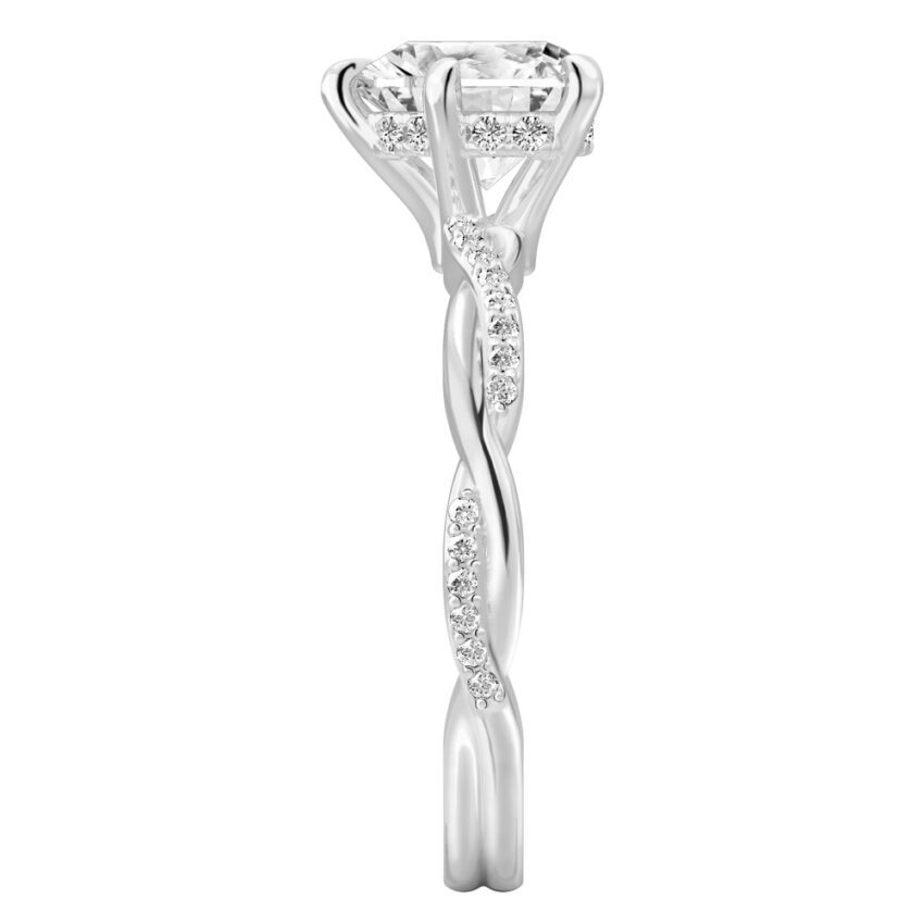 A twist hidden halo engagement ring featuring two bands intertwined together: one having pavé diamonds and the other having just metal. The center stone is held by claw prongs and features a sparkle of pavé diamonds underneath the girdle of the stone. This twist hidden halo ring takes a hint of inspiration from vines found in nature, making it a romantic choice for two people whose paths are destined to be interwoven. It is designed to match with the Twist band.